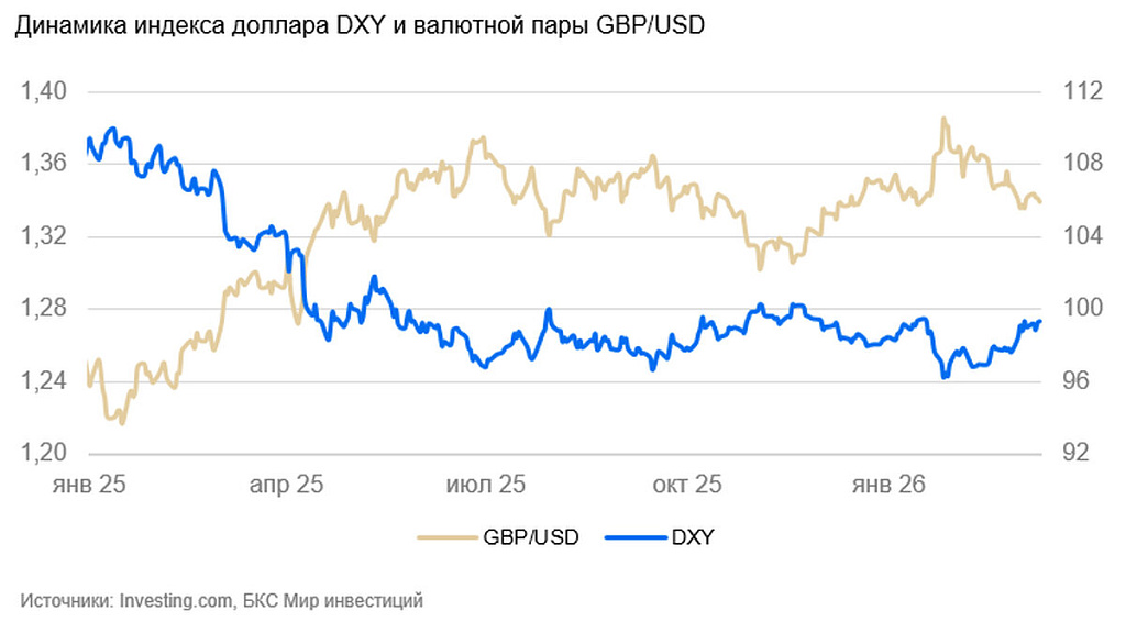 На неделе курс фунта к доллару США опустился на 0,3%, до $1,34, и оставался вблизи минимумов 2026 г. Значимых статистических данных не выходило. Насколько можно судить, фунт снизился, поскольку рынок отыгрывал повышение рисков в европейском регионе.