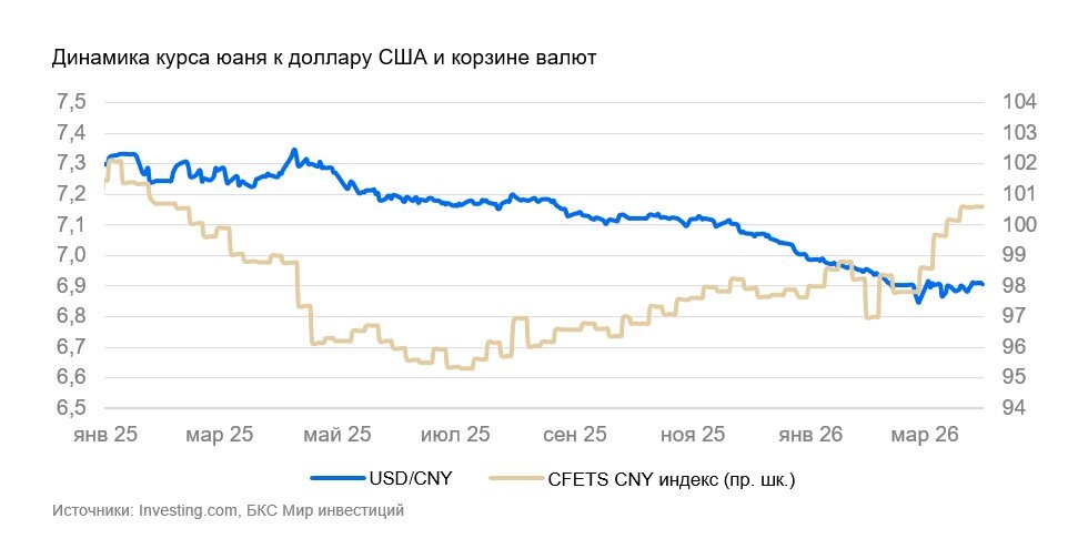 Курс юаня на неделе незначительно ослаб (-0,2%). Дополнительная волатильность последних недель, на наш взгляд, отражает колебания потоков капитала из-за иранской войны, но пока не является признаком прекращения укрепления юаня.