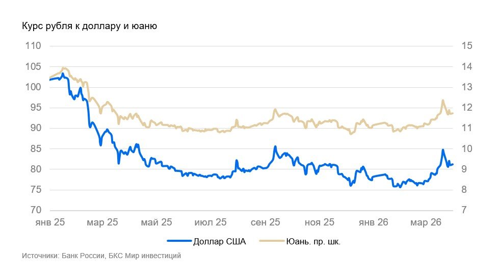 Ключевые изменения для курса рубля могут начаться лишь с конца апреля. В марте компании уплачивали налог на добычу полезных ископаемых (НДПИ) за февраль и налог на дополнительный доход от добычи углеводородного сырья (НДД) за IV квартал 2025 г. Ожидается, что они будут небольшими — около 0,7 трлн руб. А вот за март НДПИ будет рассчитываться по ценам, которые будут уже выше цены отсечения, заложенной в бюджетное правило. Ждем, что это может оказать поддержку рублю.
