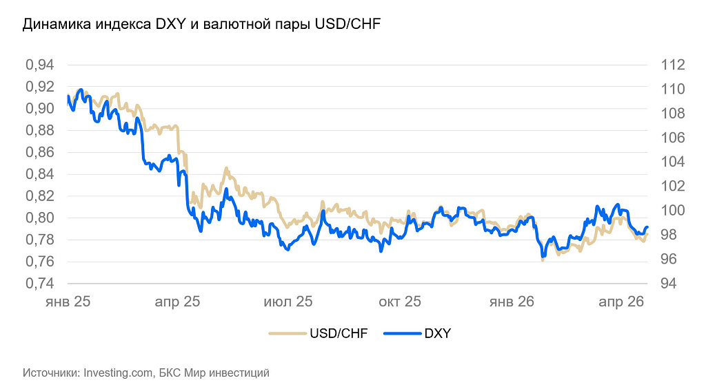 В марте торговый баланс Швейцарии составил 2,7 млрд франков ($3,4 млрд) — минимум с декабря 2023 г. Экспорт упал из-за кризисного сокращения спроса на предметы роскоши на фоне пошлин США. Импорт вырос из-за резкого подорожания химической и фармацевтической продукции в результате нефтяного шока. Пока снижение выглядит скорее разовым ответом на начало ценового кризиса. Но если иранский конфликт продолжится, торговый баланс будет слабее поддерживать франк.