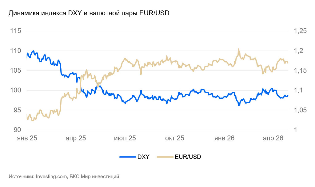 По предварительной оценке, индекс деловой активности PMI в апреле вырос с 50 до 52 п. Улучшение произошло и в секторе услуг, и в промышленности. Потребительские настроения в апреле, напротив, снизились с 53 до 50 пунктов. Инфляционные ожидания на год вперед выросли с 3,8% до 4,7% — вполне ожидаемо с учетом заметно подорожавшего топлива и других энергоносителей на фоне продления иранского конфликта.